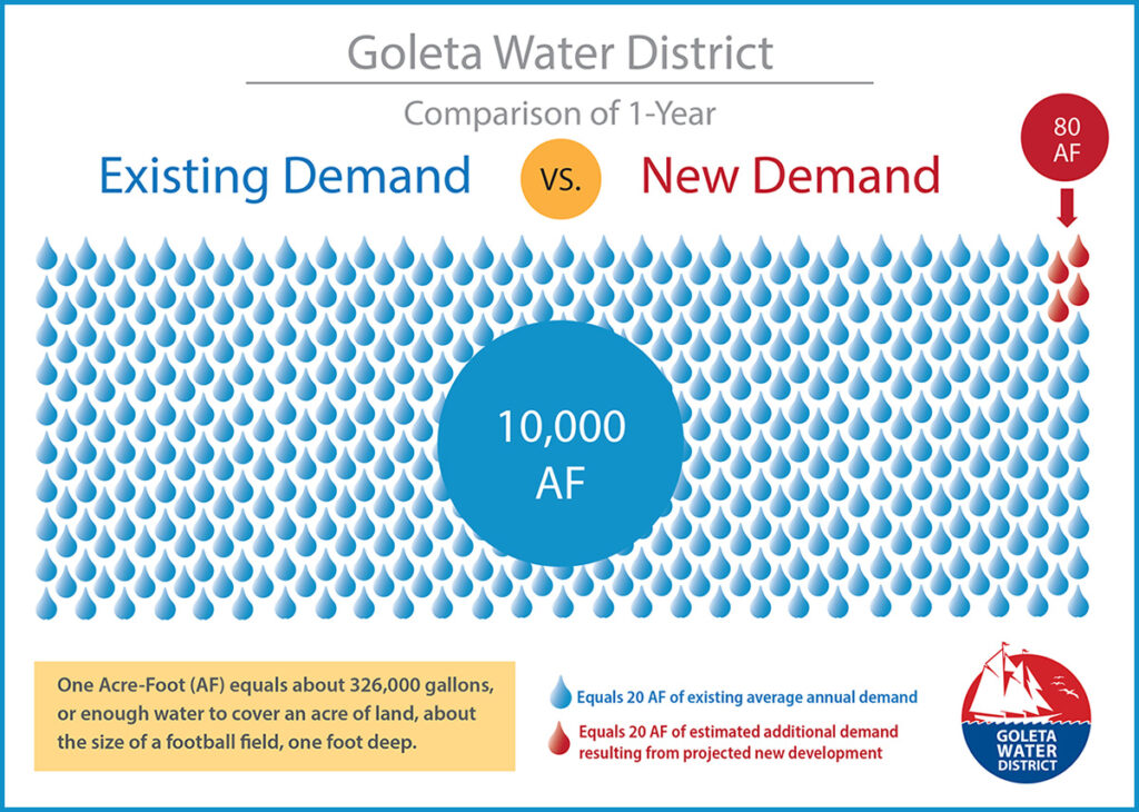 A:  Many new developments are multi-family housing units with mainly indoor water usage and shared low water use outdoor landscaping. New housing is not projected to materially increase water use, largely because of water efficiency requirements for new development and renovations, including plumbing code changes and water wise landscaping. The average multi-family residential unit uses approximately 0.15 acre-feet per year per unit, which equates to about a quarter of the average usage for a single family residence.  The District anticipates allocating approximately 80 AF of new water allocations in 2024, which is less than one percent (.08%) of average annual demand.